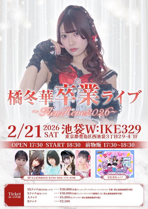 前売りチケット(SSランク) : ¥ 30,000円 / 前売りチケット(Sランク) :¥10,000円 / 前売りチケット(Aランク) ¥5,000円 / 前売りチケット(Bランク) ¥2,500円 / + drink(700円~)
